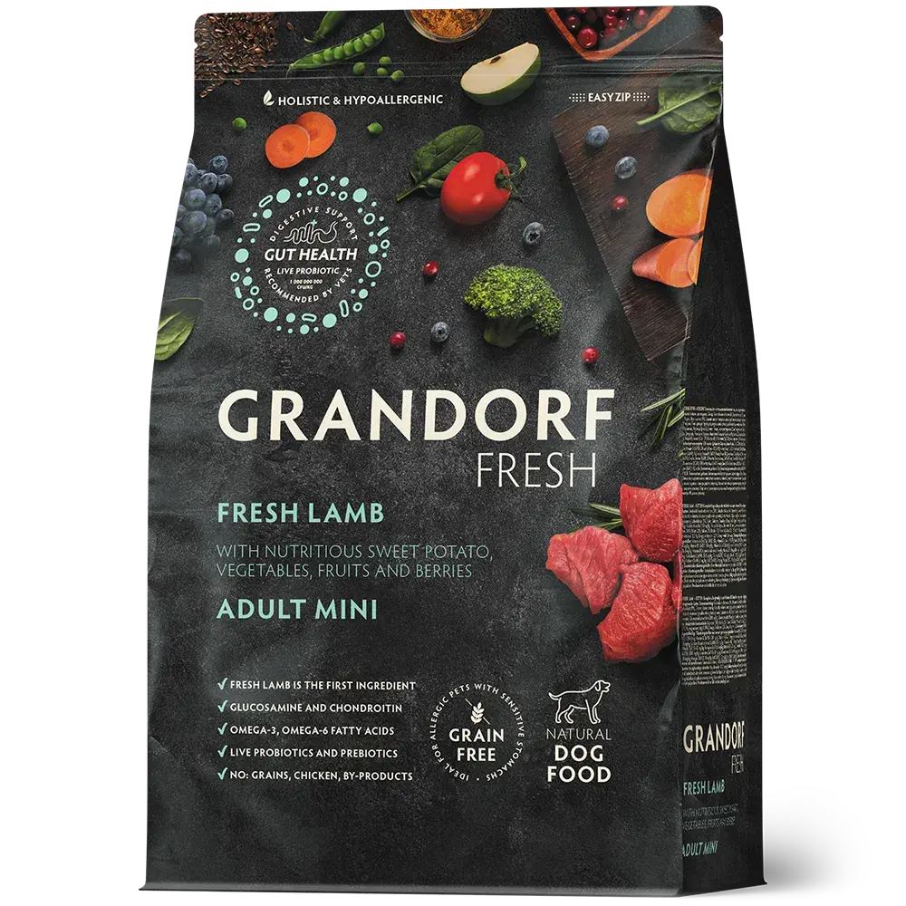Свежее бескостное мясо ягненка (26%), Дегидрированное мясо индейки (19%), Батат, Горох, Жир индейки (6%), картофель, Порошок корней цикория (натуральный источник пребиотиков: FOS и инулин), Минералы, Льняное семя, Яблоки, Морковь, Пивные дрожжи (природный источник MOS и бета-глюканов), Масло лосося (1%), Клюква, Черника, Брокколи, Шпинат, Помидоры, Глюкозамина гидрохлорид (100 мг/кг), Хондроитина сульфат (100 мг/кг), юкка Шидигера, Грейпфрут, Розмарин, Куркума.